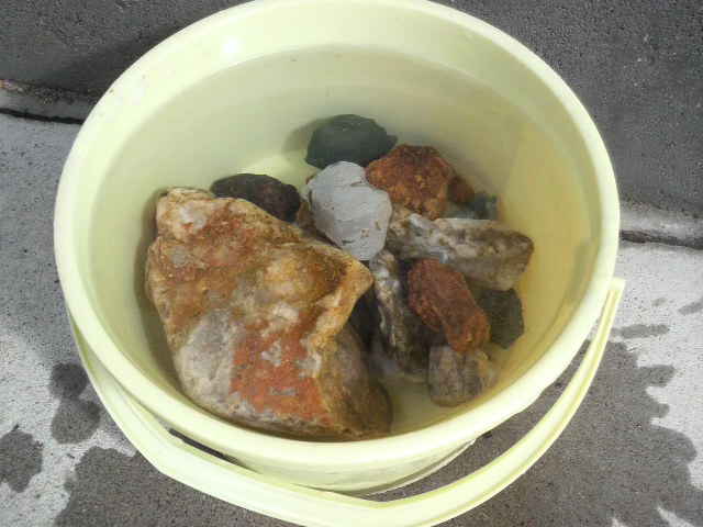 山菜採った日に採ってきたので一週間かけてすっかり乾いた石に、今日は天気も良いのでタガネ&アンビルハンマーで岩石割り。近隣に迷惑な音だなぁ・・・で、割れた。