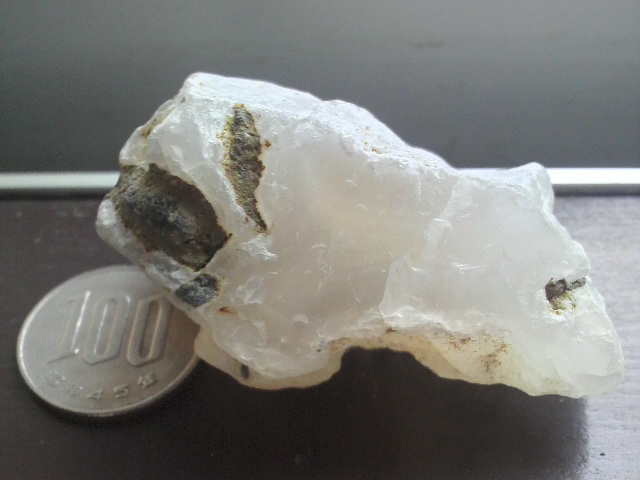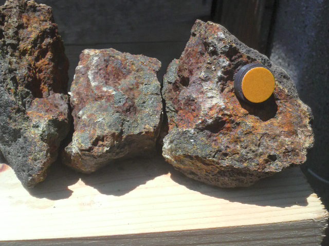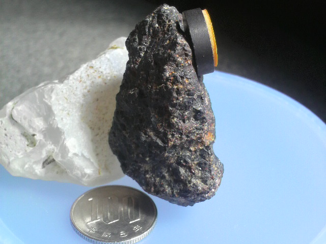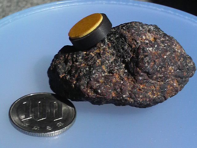 山神様の恩赦受けてか百円分の価値があるのかは定かではないが、もしコレが磁鉄鉱であれば表面の赤い磁石のくっ付きにくい場所は共成鉱物である灰鉄ざくろ石、ガーネットの仲間かもしれない。などと勝手に妄想で推測w